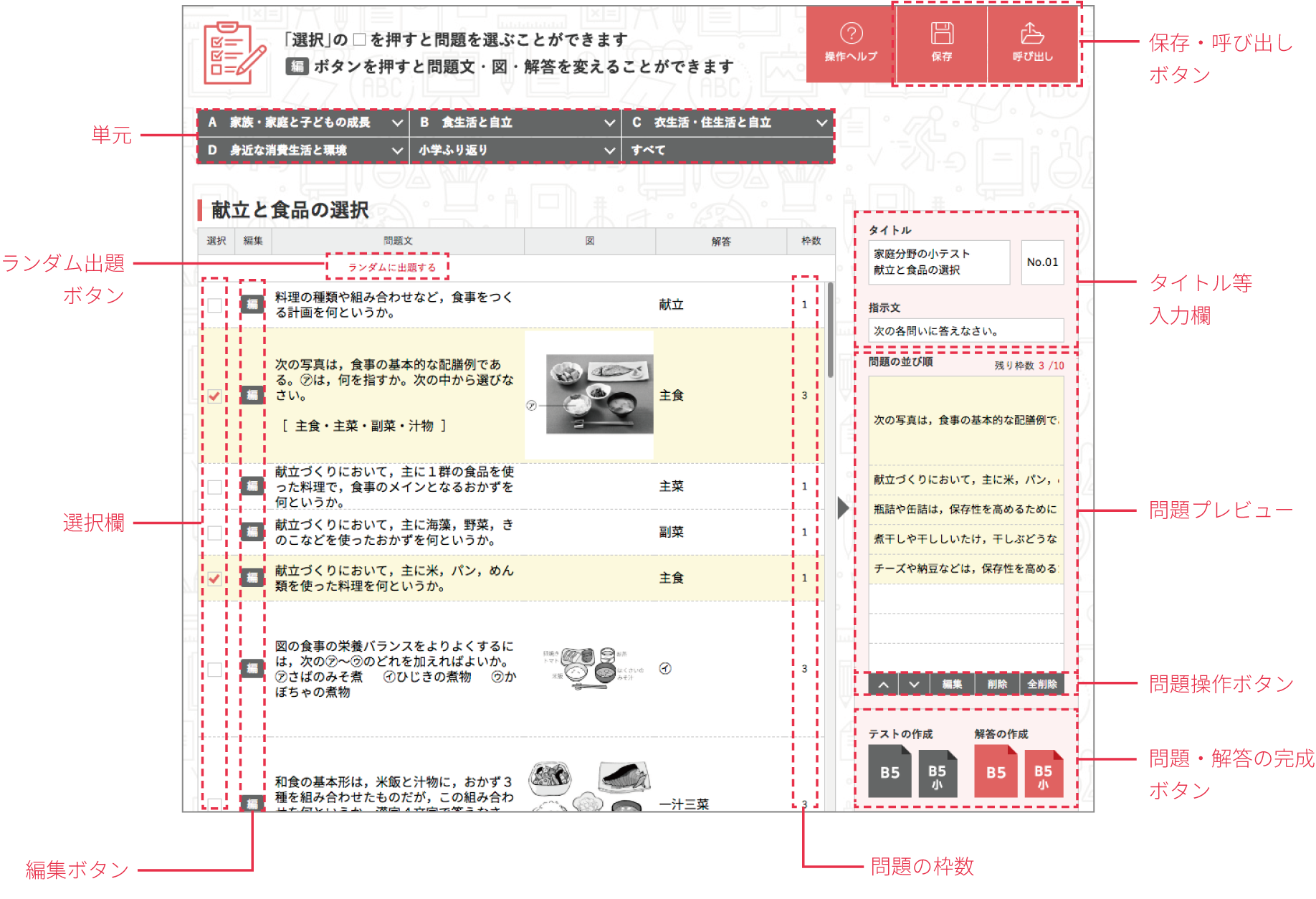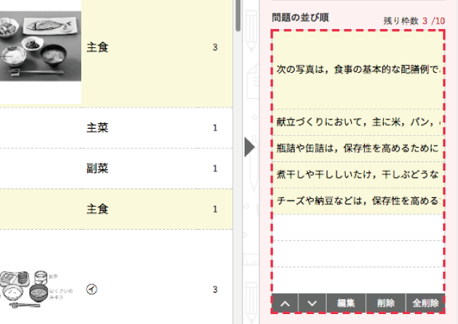 選ばれた問題は,画面右の問題プレビューに表示されます。 問題操作ボタンを押せば,問題順の並びかえや削除などを行うことができます。 |