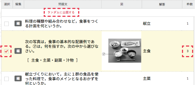 出題したい問題文の左にある選択欄をクリックしてください。 1回分のテストには,最大で10 枠分の問題を入れることができます。 問題の枠数の合計が1〜10 になるように問題を選んでください。 |