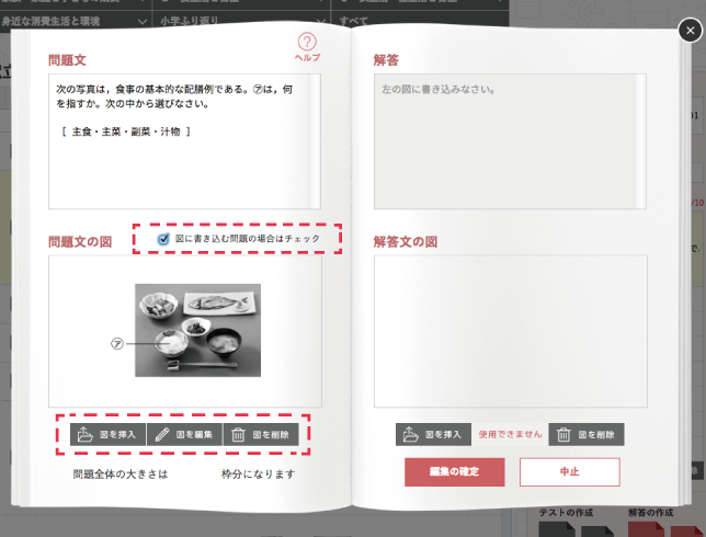 問題にお手持ちの図を挿入したいときは「図を挿入」を, 挿入してある図を消したいときは「図を削除」を選んでください。 また,作図問題をつくりたいときは,「画像に答えを書き込む問題にする」のにチェックを入れてください。 すると,新たに右側に解答画像の枠が表示されるので,そちらに解答用の図を挿入してください。 |