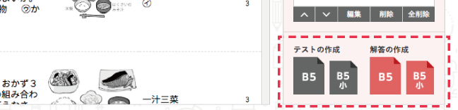 全ての入力が終わったら問題・解答の完成ボタンを選んでください。 「B 5」はB 5判ぴったりのサイズ,「B 5小」はノートにはれるようにB 5を少し縮小したサイズでテストが作れます。 |