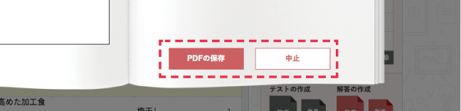 画面上で小テストの完成イメージを確認してください。 「PDF の保存」を選ぶと,テストをPDF 形式のデータで保存することができます。 「中止」を選ぶと,問題選択画面に戻ります。 |