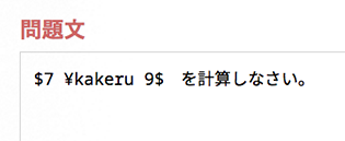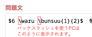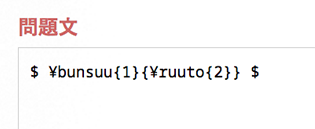 問題編集画面では,数式や記号がコマンド入力された状態の テキストが表示されます。 このテキストを編集することで,お望みの数式を出力できます。 |